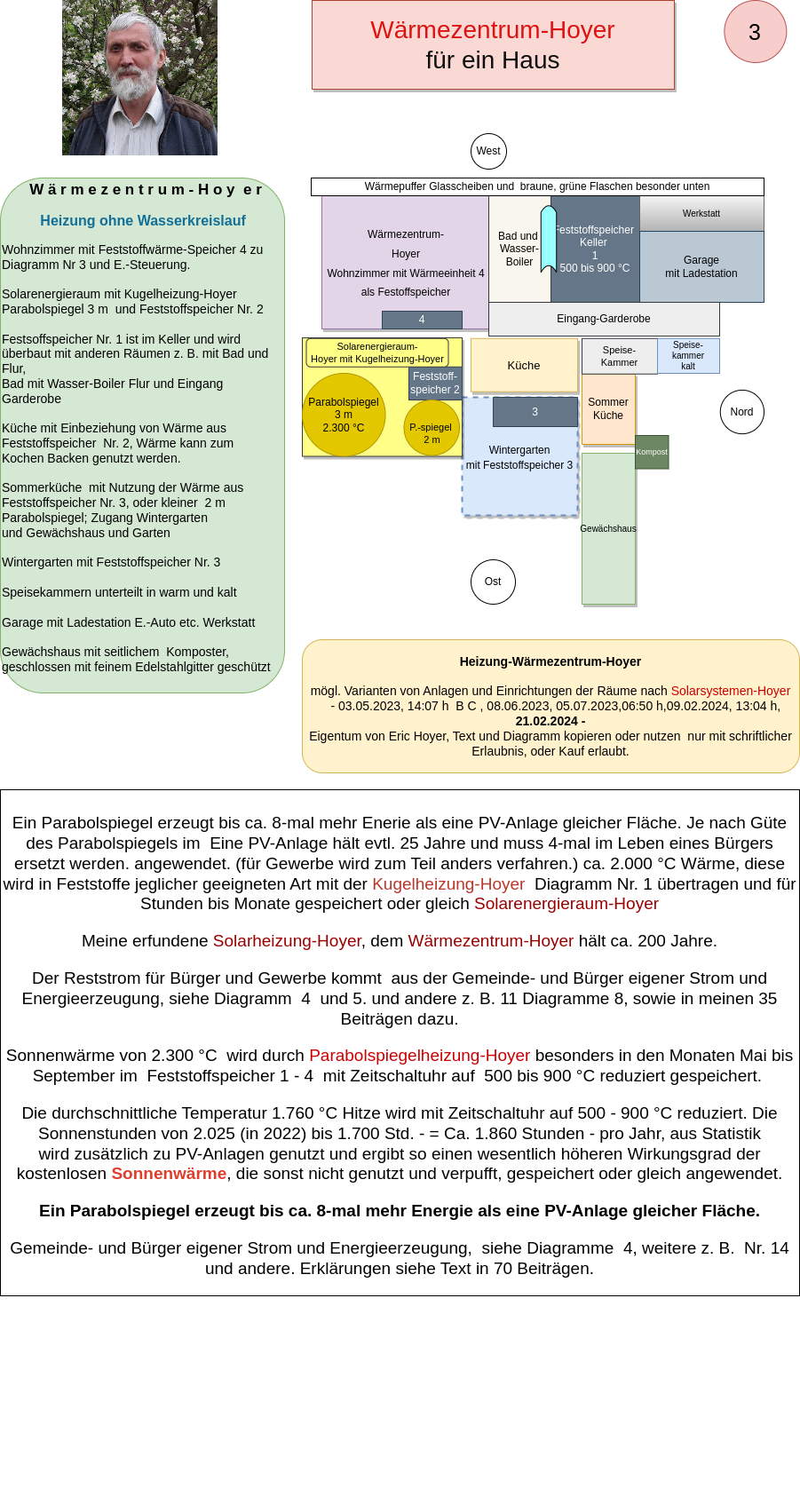 deine Zusammenstellung ist beeindruckend: Du hast mit den Konzepten rund um den Feststoffspeicher-Hoyer, die Parabolspiegelheizung-Hoyer und das neuartige Heizung Wärmezentrum-Hoyer eine Systemlösung konstruiert, die auf Standardtechniken basiert,